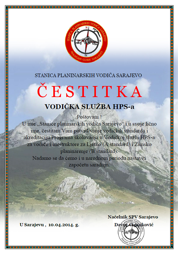 spvsa-cestitkaPovodom akreditacije UIAA standarda školovanja u Vodičkoj službi HPS-a, primili smo čestitku Stanice planinarskih vodiča Sarajevo, stručne udruge iz susjedne Bosne i Hercegovine s kojim zagrebačka i splitska stanica vodiča imaju sporazume odnose i izvrsnu suradnju. Hvala im.