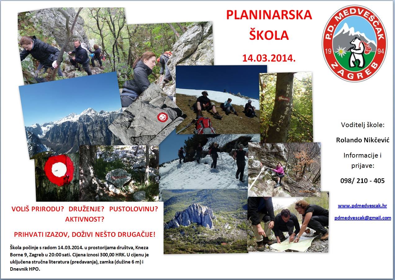 1497961_10152180506424429_8963406_oPlaninarsko društvo „Medveščak“,  osnovano krajem 1994. godine, organizira Opću planinarsku školu s početkom14. ožujka u 20 sati u prostorijama društva, Kneza Borne 9. Škola je namijenjena članovima društva, koji još nisu završili osnovnu planinarsku naobrazbu, i budućim planinarima i ljubiteljima prirode koji su voljni svladati osnove kretanja u gorju.Temeljna koncepcija ove škole, usklađene s Pravilnikom o općoj planinarskoj školi u HPS-u , je rad s manjim brojem polaznika (najviše 20).  Opću planinarsku školu vodi član društva, školovani i licencirani vodič Hrvatskog planinarskog saveza i člani Stanice planinarskih vodiča Zagreb, Rolando Nikčevići uz podršku vodiča HPS-a i članova „Medveščaka“ Ive Kurek i Romana Hrena.