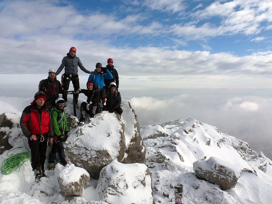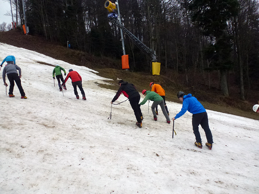 25.-26. siječnja proveden je je zanimljiv i edukativan vikend na svježe zasnježenom Velikom Risnjaku (1528 m). U visokogorstvu, kad se spremamo na nekom mjestu boraviti dulje, odmora nema po dolasku na lokaciju. Vrlo brzo su uspostavljeni timovi zaduženi za pripremu lokacije za postavljanje šatora (dozvolu za šatoriranje i edukativne vježbe na vršnom dijelu Risnjaka dobili smo od uprave Nacionalnog Parka Risnjak), podizanje šatora, tim zadužen za vodu i prehranu, tim za ogrijev i vatru te „leteći odred“ za kuhanje i stalno opskrbljivanje toplim čajem. U snježnom nanosu zapadno od Schlosserovog doma ukopani su vjetrobrani i postavljeni su šatori na najzaštićenijim mjestima gdje se i noćilo. Drugi dan formirane su tri naveze i zadani zadaci simulacije kretanja po strmini paralelno s postavljanjem međuosiguranja, s prvim kao osiguravateljem naveze te s trećim koji osigurava navezu prilikom penjanja.