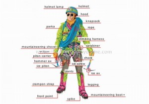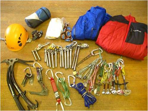 Alpinistička oprema. Alpinisti za svoje djelovanje trebaju primjerenu alpinističku opremu. Oprema alpinista uključuje odjeću i obuću koja alpiniste štiti od metoroloških utjecaja sunca, vjetra, vlage, hladnoće kao i zaštita od abrazivnog djelovanja stijene po kojoj se kreću. Alpinističku opremu čine i alpinistički alati (oruđa) koja alpinistima omogućavaju rješavanje zahtjevnosti alpinističkih uspona na relativno siguran način.