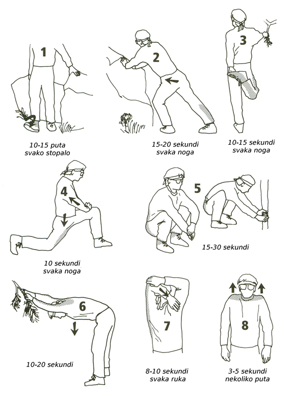1. Zagrijavanje i istezanje prije povećanog fizičkog napora (na početku planinarenja, za vrijeme odmora, prije stavljanja teškog ruksaka na leđa).
