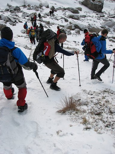 4. Koristiti planinarske štapove. Štapovi omogućuju više uporišnih točaka i na taj način olakšavaju uspon. Prilikom silaženja mogu također biti dodatan oslonac pri skliskom ili trusljivom terenu.