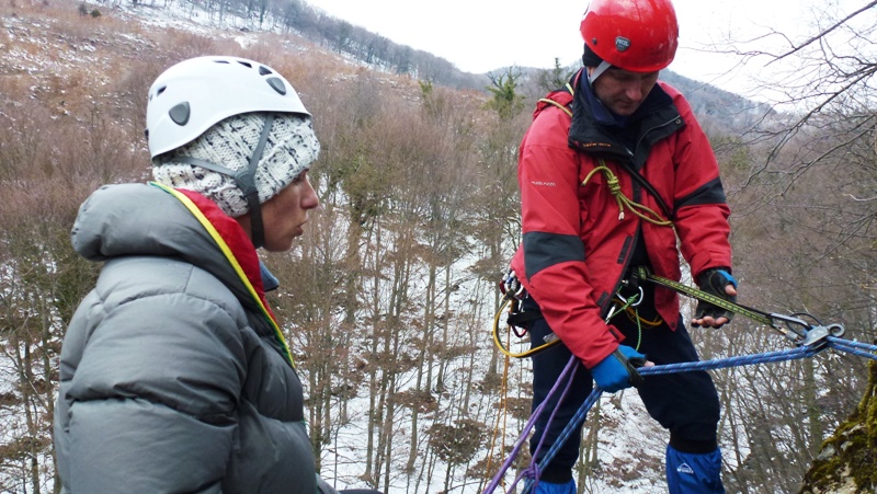 P1020153Drugi dan Seminara, dvije skupine su se ujedinile te u dvije mješovite grupe na lokalitetu Gorsko zrcalo izvele vježbu postavljanja rukohvata te abseila gdje su ulogu vodiča odigrali sportski penjači i alpinisti pripravnici, polaznici Seminara. Slijedile su vježbe i demonstracije izrade sustava za podizanje, osiguravanje i spuštanje vođene osobe te potražna vježba s akcijom pružanja prve pomoći i transporta unesrećene osobe.
