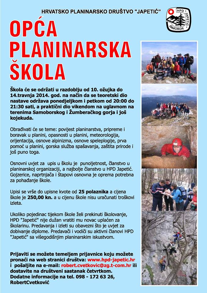 1505542_287954768018679_1122536369_nNaučite kako se pripremiti za odlazak u planinu, kako se kretati i orijentirati u planini, što je to brdo, a što planina. Saznajte nešto o špiljama, alpinizmu, o osnovama meteorologije i opasnostima u planini. Predavanja (vrlo interesantna i interaktivna), održavaju se u prostorijama Društva. Predavači su vodiči HPS-a i članovi HGSS-a te ostali stručni planinari, a nedjeljom su izleti s praktičnom primjenom stečenoga znanja.