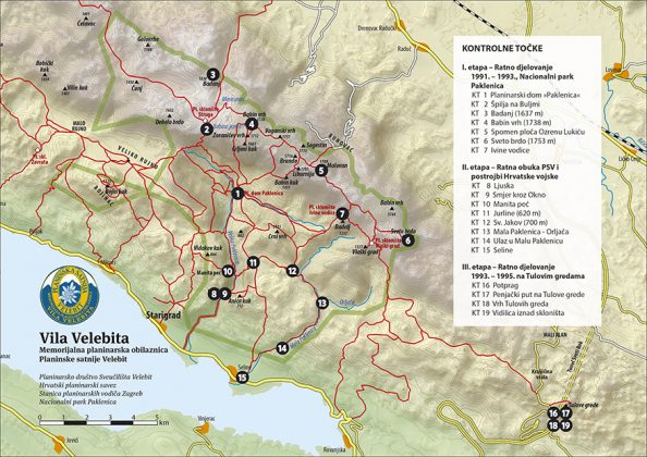 Na prvoj etapi obuhvaćene su kontrolne točke u NP Paklenica, koje su povezane s djelovanjem Satnije od 1991. do 1993. Kontrolne točke su Planinarski dom »Paklenica«, Špilja na Buljmi, Badanj (1638 m), Babin vrh (1738 m), Spomen ploča Ozrenu Lukiću, Sveto brdo (1753 m) i Ivine vodice. Druga etapa povezuje točke važne za ratnu obuku pripadnika PSV i drugih postrojbi Hrvatske vojske. To su Ljuska, Smjer kroz Okno, Manita peć, Jurline (620 m), Sv. Jakov (700 m), Mala Paklenica – Orljača, Ulaz u Malu Paklenicu i Seline. Treća etapa obuhvaća četiri kontrolne točke na području Tulovih greda, gdje je Planinska satnija Velebit djelovala u razdoblju od 1993. do 1995. Na toj etapi kontrolne točke su Podprag, Penjački put na Tulove grede, Vrh Tulovih greda i Vidilica iznad skloništa.