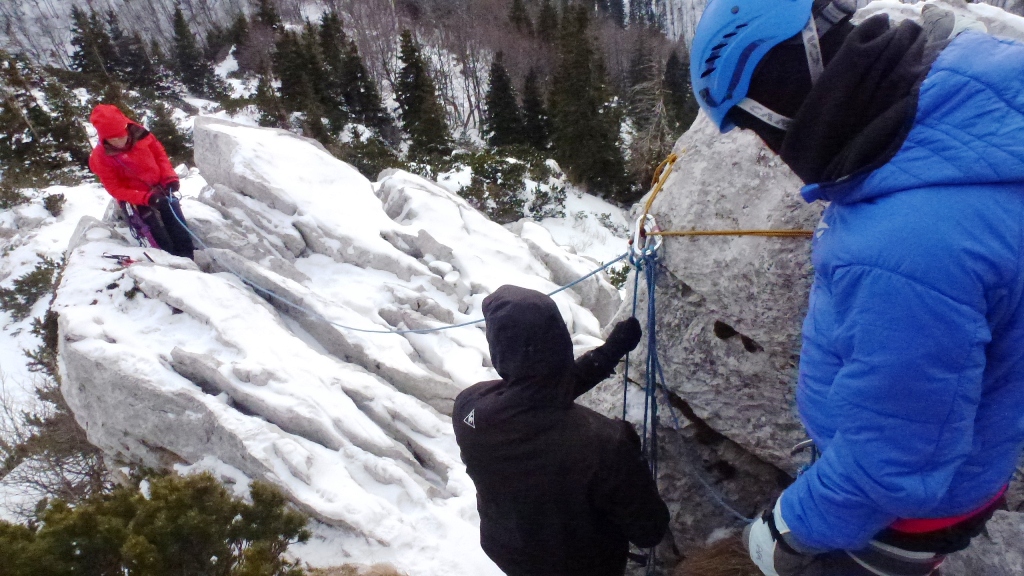 Grupa je krenula od PD Sušak na platku te na putu do Cajtiga i doma na Risnjaku izvodila vježbe hodnje u krpljama i derezama a na platou kod doma vodič i dva pripravnika demonstrirali su snježna sidrišta s cepinima i suzu te sidrište na fiksni object te izvedene su tehnike osiguranja kod napredovanja u većoj strmini u stijeni i snijegu.